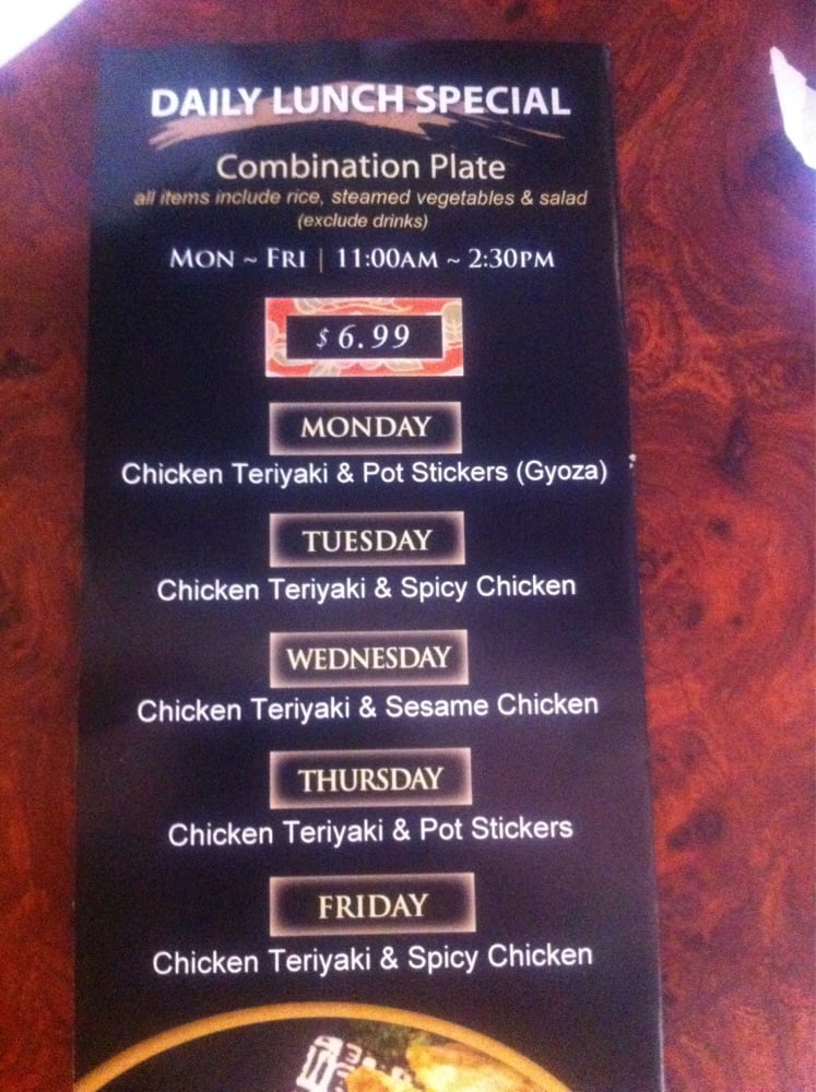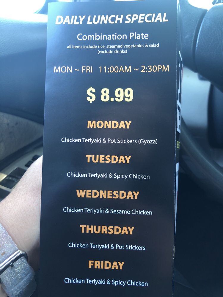 Chicken teriyaki,pot stickers (3pc) and california roll(4pc) with green salad ,steamed vegetable and rice.