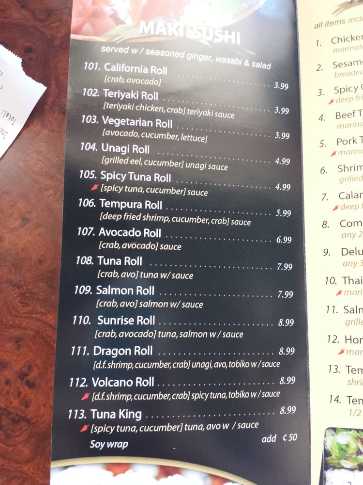 Deep–fried sushi. Included spicy tuna, crab, cream cheese, and shrimp tempura.
