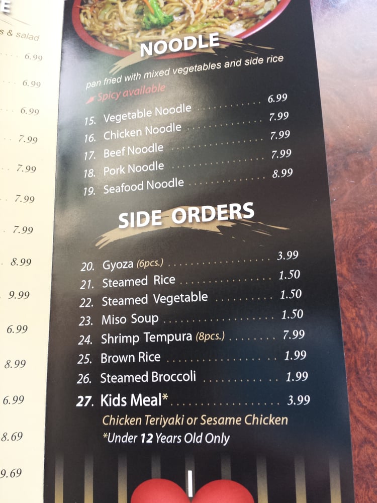 Chicken or Sesame chicken. Kids meal is rice and meat only.